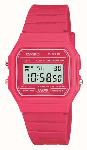 - A hot pink resin band secures the watch to the wrist.